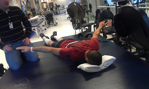 Well, Josh got upgraded to a less-restricting brace! He didn't know how he felt about that though. It felt weird to have so much more freedom. But he got over that real quick. :) He got to do physical therapy on his stomach. Joe had him do different strength exercises he couldn't do if he had that huge brace on. He worked him pretty hard!